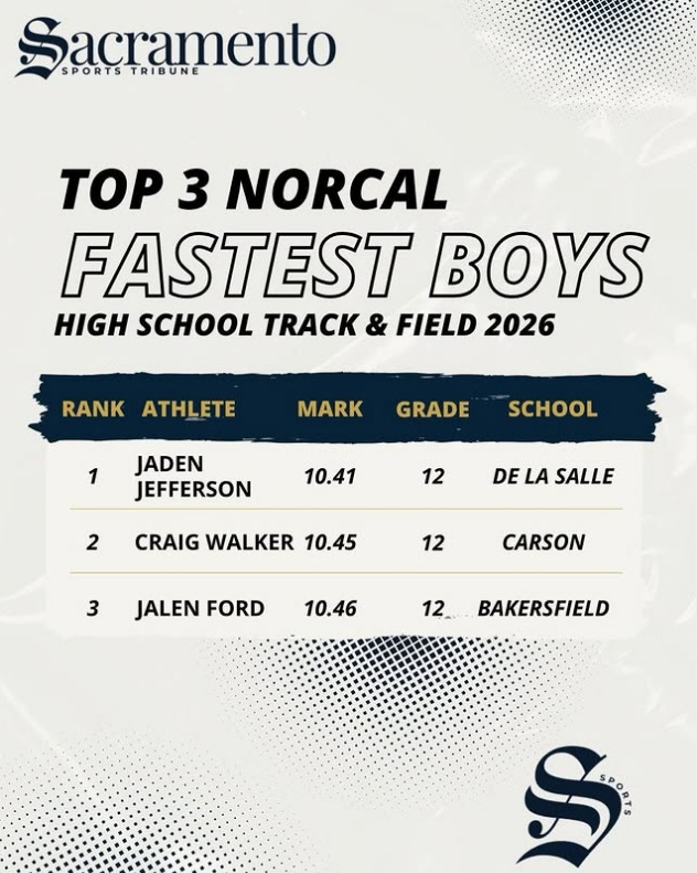 De La Salle senior Jaden Jefferson currently holds the fastest 100m time in Northern California this season with an impressive 10.41. His explosive start and top-end speed have helped him set the pace early as one of the premier sprinters in the state.